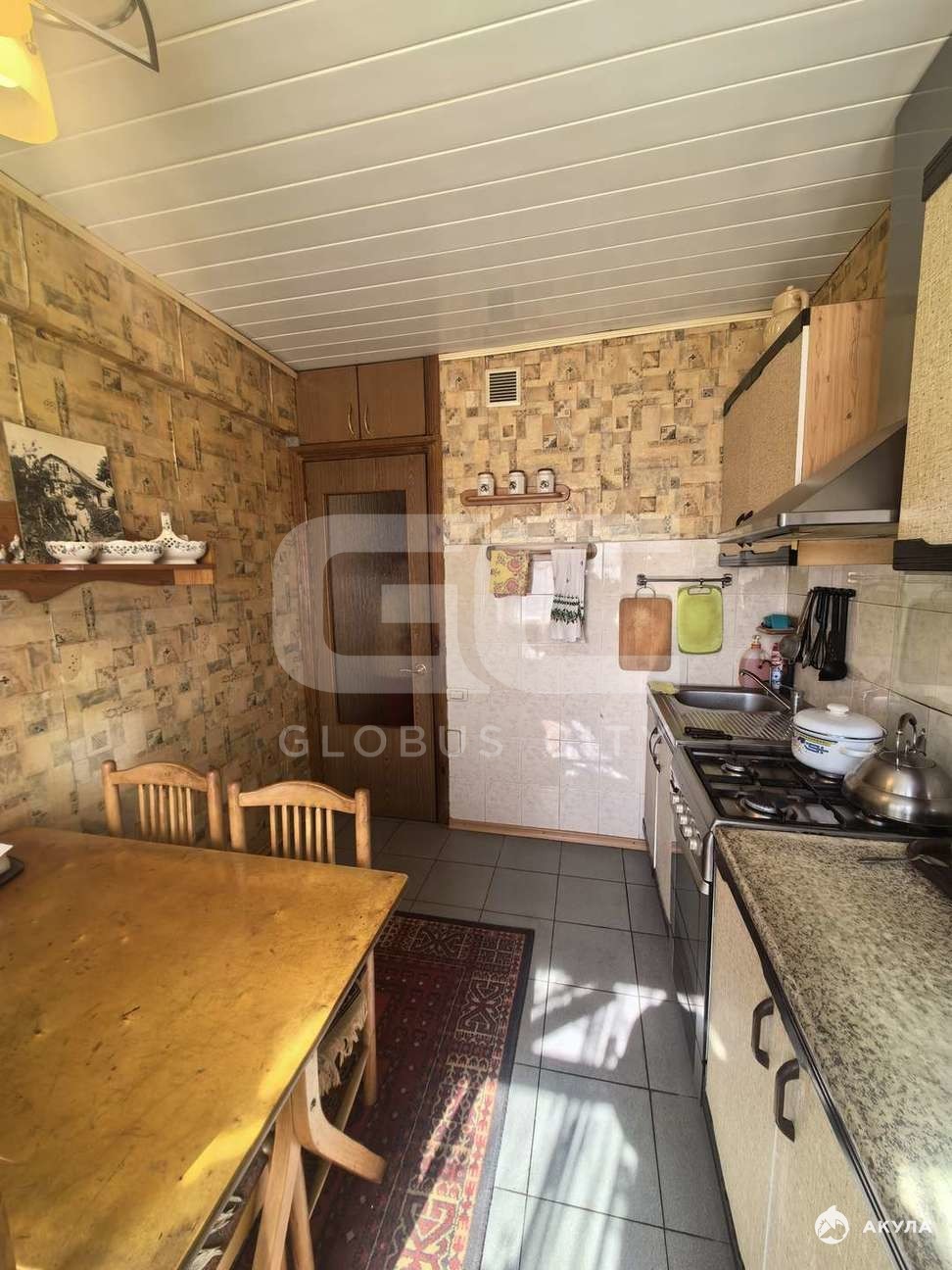 - стены оклеены обоями, потолок отделан пластиковыми панелями и плиткой;